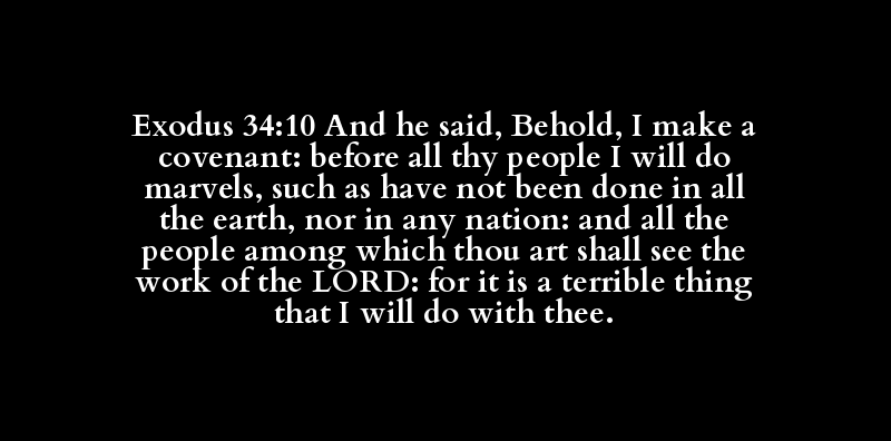 Exodus 34:10 And he said, Behold, I make a covenant: before all thy people I will do marvels, such as have not been done in all the earth, nor in any nation: and all the people among which thou art shall see the work of the LORD: for it is a terrible thing that I will do with thee.