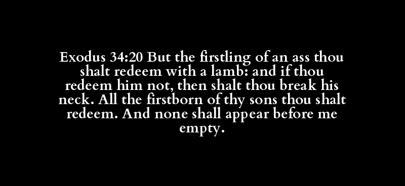Exodus 34:20 But the firstling of an ass thou shalt redeem with a lamb: and if thou redeem him not, then shalt thou break his neck. All the firstborn of thy sons thou shalt redeem. And none shall appear before me empty.