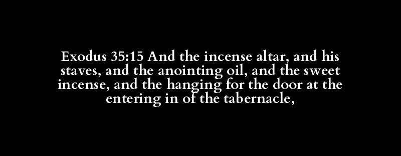 Exodus 35:15 And the incense altar, and his staves, and the anointing oil, and the sweet incense, and the hanging for the door at the entering in of the tabernacle,