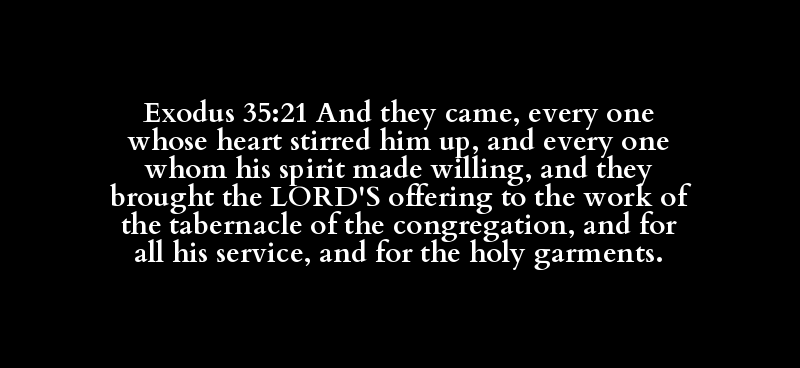 Exodus 35:21 And they came, every one whose heart stirred him up, and every one whom his spirit made willing, and they brought the LORD'S offering to the work of the tabernacle of the congregation, and for all his service, and for the holy garments.