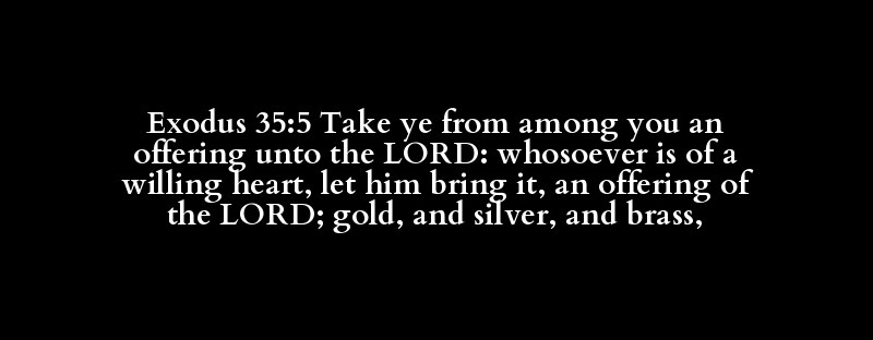 Exodus 35:5 Take ye from among you an offering unto the LORD: whosoever is of a willing heart, let him bring it, an offering of the LORD; gold, and silver, and brass,