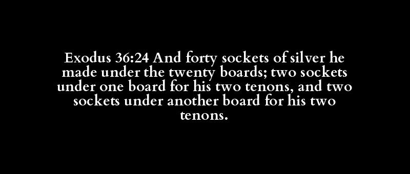 Exodus 36:24 And forty sockets of silver he made under the twenty boards; two sockets under one board for his two tenons, and two sockets under another board for his two tenons.