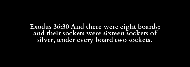 Exodus 36:30 And there were eight boards; and their sockets were sixteen sockets of silver, under every board two sockets.
