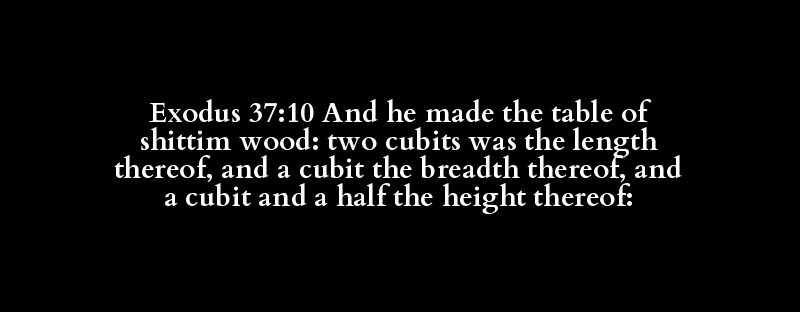 Exodus 37:10 And he made the table of shittim wood: two cubits was the length thereof, and a cubit the breadth thereof, and a cubit and a half the height thereof: