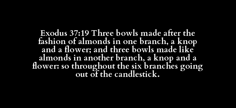Exodus 37:19 Three bowls made after the fashion of almonds in one branch, a knop and a flower; and three bowls made like almonds in another branch, a knop and a flower: so throughout the six branches going out of the candlestick.
