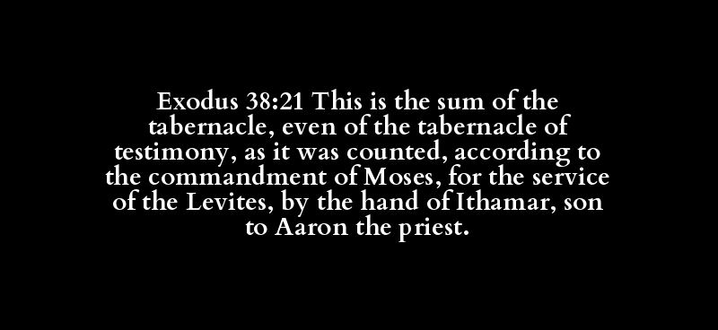 Exodus 38:21 This is the sum of the tabernacle, even of the tabernacle of testimony, as it was counted, according to the commandment of Moses, for the service of the Levites, by the hand of Ithamar, son to Aaron the priest.