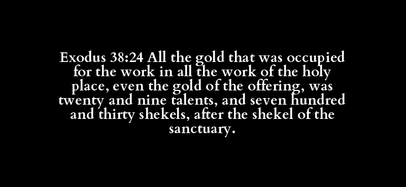 Exodus 38:24 All the gold that was occupied for the work in all the work of the holy place, even the gold of the offering, was twenty and nine talents, and seven hundred and thirty shekels, after the shekel of the sanctuary.