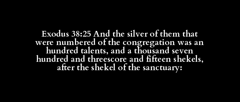 Exodus 38:25 And the silver of them that were numbered of the congregation was an hundred talents, and a thousand seven hundred and threescore and fifteen shekels, after the shekel of the sanctuary: