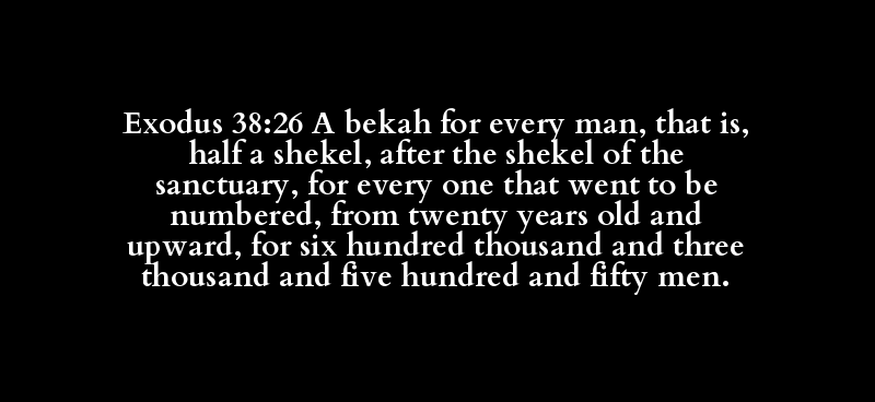 Exodus 38:26 A bekah for every man, that is, half a shekel, after the shekel of the sanctuary, for every one that went to be numbered, from twenty years old and upward, for six hundred thousand and three thousand and five hundred and fifty men.