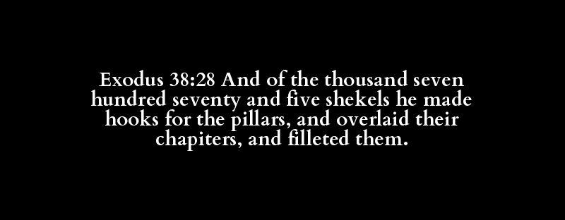 Exodus 38:28 And of the thousand seven hundred seventy and five shekels he made hooks for the pillars, and overlaid their chapiters, and filleted them.