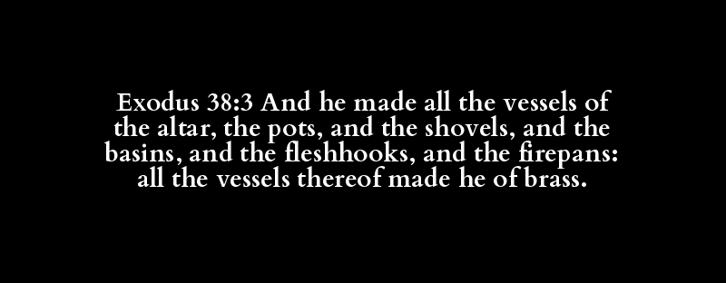 Exodus 38:3 And he made all the vessels of the altar, the pots, and the shovels, and the basins, and the fleshhooks, and the firepans: all the vessels thereof made he of brass.