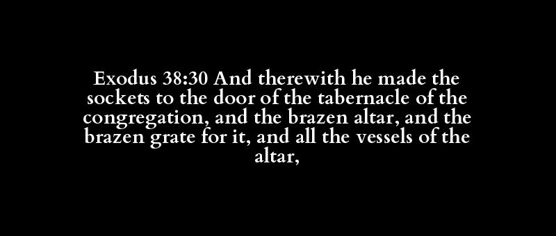 Exodus 38:30 And therewith he made the sockets to the door of the tabernacle of the congregation, and the brazen altar, and the brazen grate for it, and all the vessels of the altar,
