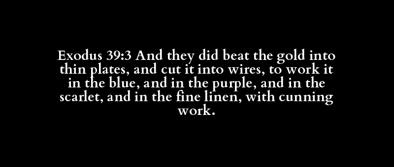 Exodus 39:3 And they did beat the gold into thin plates, and cut it into wires, to work it in the blue, and in the purple, and in the scarlet, and in the fine linen, with cunning work.