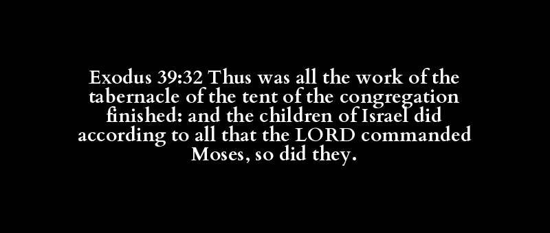 Exodus 39:32 Thus was all the work of the tabernacle of the tent of the congregation finished: and the children of Israel did according to all that the LORD commanded Moses, so did they.