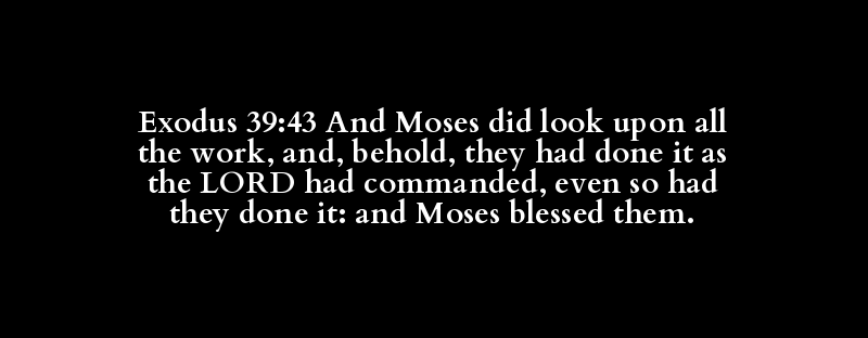 Exodus 39:43 And Moses did look upon all the work, and, behold, they had done it as the LORD had commanded, even so had they done it: and Moses blessed them.