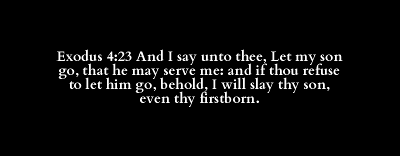 Exodus 4:23 And I say unto thee, Let my son go, that he may serve me: and if thou refuse to let him go, behold, I will slay thy son, even thy firstborn.