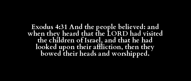 Exodus 4:31 And the people believed: and when they heard that the LORD had visited the children of Israel, and that he had looked upon their affliction, then they bowed their heads and worshipped.
