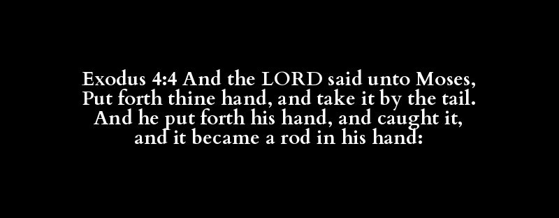 Exodus 4:4 And the LORD said unto Moses, Put forth thine hand, and take it by the tail. And he put forth his hand, and caught it, and it became a rod in his hand: