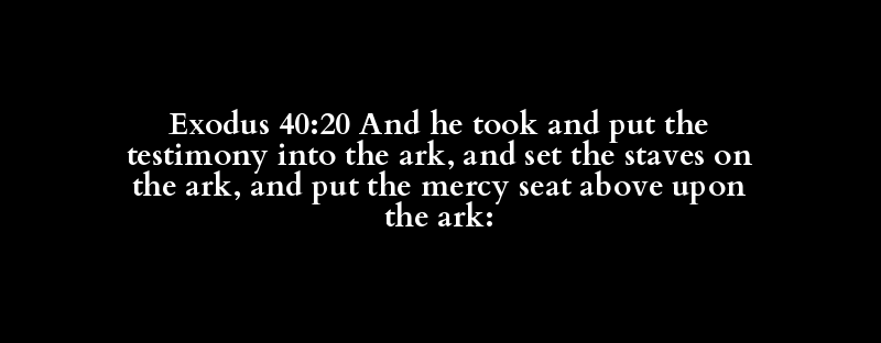 Exodus 40:20 And he took and put the testimony into the ark, and set the staves on the ark, and put the mercy seat above upon the ark: