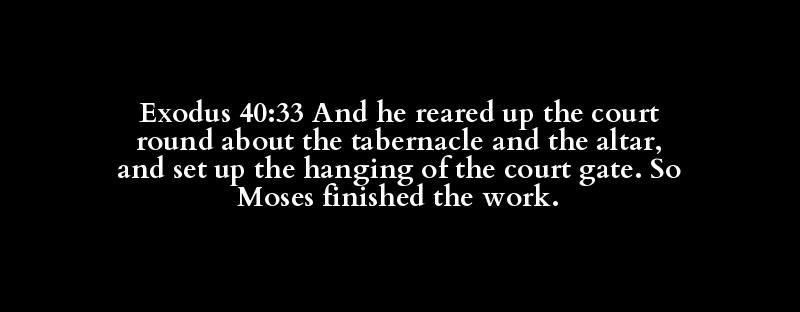 Exodus 40:33 And he reared up the court round about the tabernacle and the altar, and set up the hanging of the court gate. So Moses finished the work.