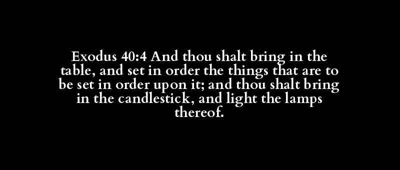 Exodus 40:4 And thou shalt bring in the table, and set in order the things that are to be set in order upon it; and thou shalt bring in the candlestick, and light the lamps thereof.