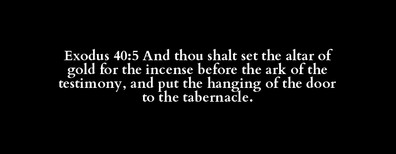 Exodus 40:5 And thou shalt set the altar of gold for the incense before the ark of the testimony, and put the hanging of the door to the tabernacle.