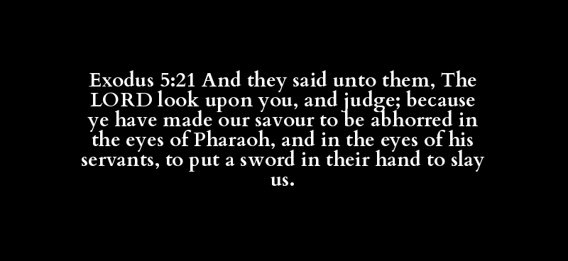 Exodus 5:21 And they said unto them, The LORD look upon you, and judge; because ye have made our savour to be abhorred in the eyes of Pharaoh, and in the eyes of his servants, to put a sword in their hand to slay us.