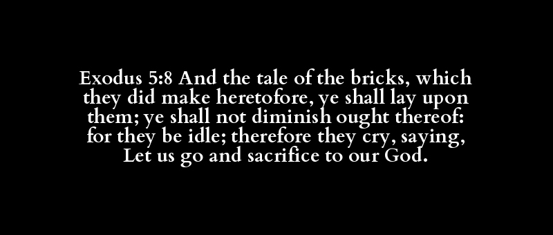 Exodus 5:8 And the tale of the bricks, which they did make heretofore, ye shall lay upon them; ye shall not diminish ought thereof: for they be idle; therefore they cry, saying, Let us go and sacrifice to our God.