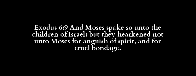 Exodus 6:9 And Moses spake so unto the children of Israel: but they hearkened not unto Moses for anguish of spirit, and for cruel bondage.