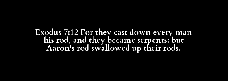 Exodus 7:12 For they cast down every man his rod, and they became serpents: but Aaron's rod swallowed up their rods.
