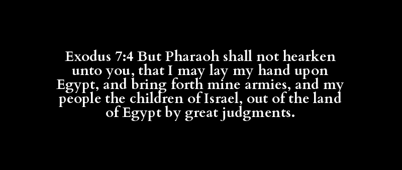 Exodus 7:4 But Pharaoh shall not hearken unto you, that I may lay my hand upon Egypt, and bring forth mine armies, and my people the children of Israel, out of the land of Egypt by great judgments.