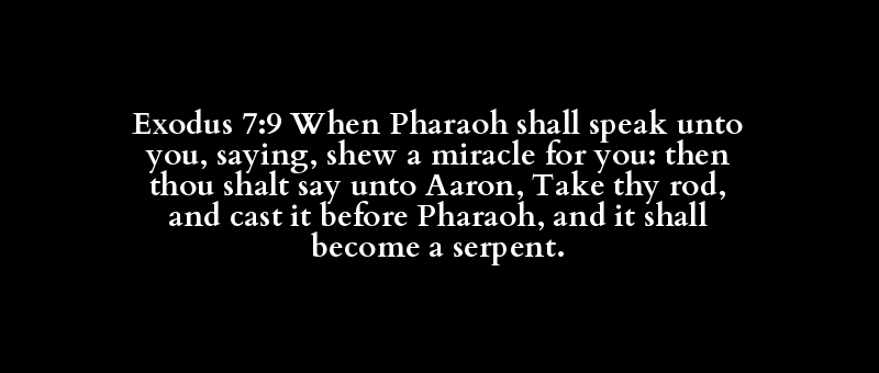 Exodus 7:9 When Pharaoh shall speak unto you, saying, shew a miracle for you: then thou shalt say unto Aaron, Take thy rod, and cast it before Pharaoh, and it shall become a serpent.
