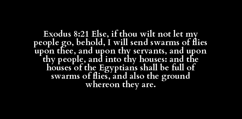 Exodus 8:21 Else, if thou wilt not let my people go, behold, I will send swarms of flies upon thee, and upon thy servants, and upon thy people, and into thy houses: and the houses of the Egyptians shall be full of swarms of flies, and also the ground whereon they are.