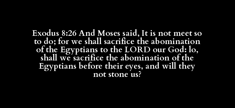 Exodus 8:26 And Moses said, It is not meet so to do; for we shall sacrifice the abomination of the Egyptians to the LORD our God: lo, shall we sacrifice the abomination of the Egyptians before their eyes, and will they not stone us?