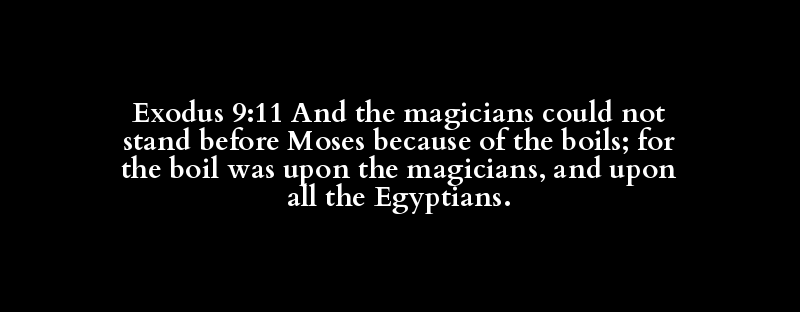 Exodus 9:11 And the magicians could not stand before Moses because of the boils; for the boil was upon the magicians, and upon all the Egyptians.