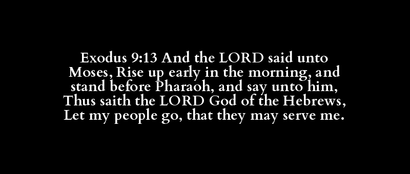 Exodus 9:13 And the LORD said unto Moses, Rise up early in the morning, and stand before Pharaoh, and say unto him, Thus saith the LORD God of the Hebrews, Let my people go, that they may serve me.