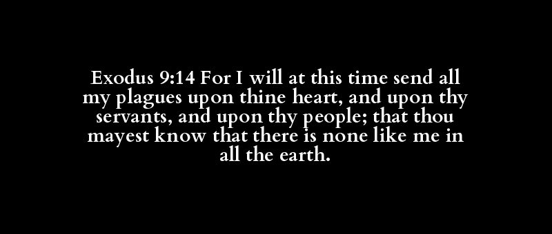 Exodus 9:14 For I will at this time send all my plagues upon thine heart, and upon thy servants, and upon thy people; that thou mayest know that there is none like me in all the earth.