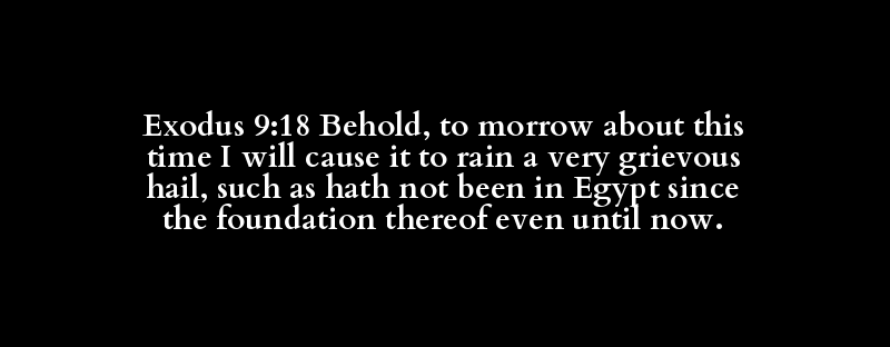 Exodus 9:18 Behold, to morrow about this time I will cause it to rain a very grievous hail, such as hath not been in Egypt since the foundation thereof even until now.