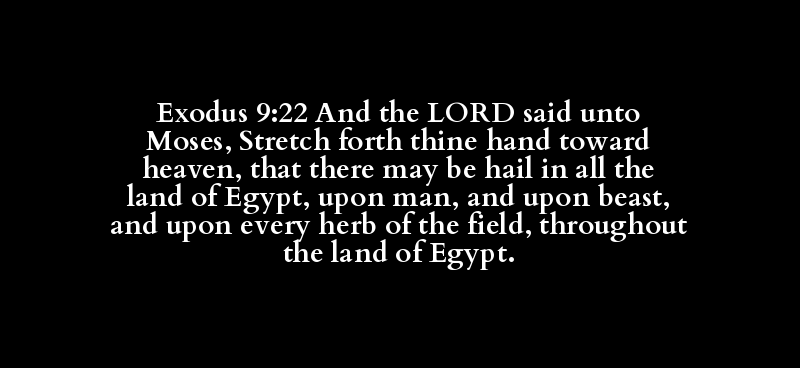 Exodus 9:22 And the LORD said unto Moses, Stretch forth thine hand toward heaven, that there may be hail in all the land of Egypt, upon man, and upon beast, and upon every herb of the field, throughout the land of Egypt.