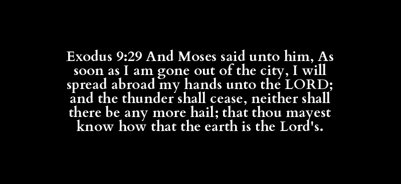 Exodus 9:29 And Moses said unto him, As soon as I am gone out of the city, I will spread abroad my hands unto the LORD; and the thunder shall cease, neither shall there be any more hail; that thou mayest know how that the earth is the Lord's.