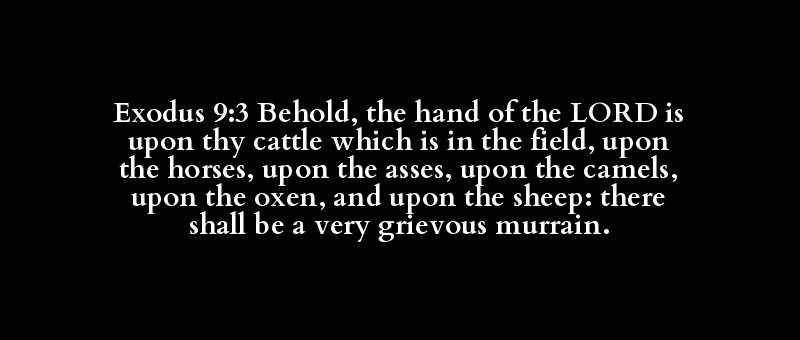 Exodus 9:3 Behold, the hand of the LORD is upon thy cattle which is in the field, upon the horses, upon the asses, upon the camels, upon the oxen, and upon the sheep: there shall be a very grievous murrain.