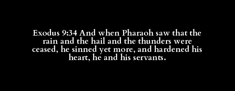Exodus 9:34 And when Pharaoh saw that the rain and the hail and the thunders were ceased, he sinned yet more, and hardened his heart, he and his servants.