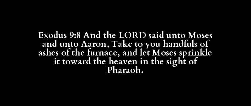 Exodus 9:8 And the LORD said unto Moses and unto Aaron, Take to you handfuls of ashes of the furnace, and let Moses sprinkle it toward the heaven in the sight of Pharaoh.