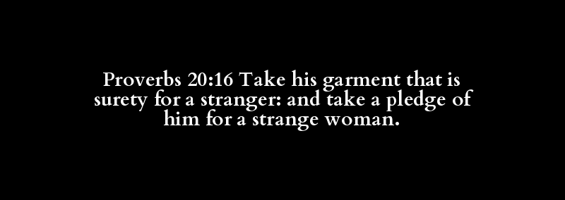 Proverbs 20:16 Take his garment that is surety for a stranger: and take a pledge of him for a strange woman.