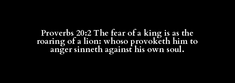 Proverbs 20:2 The fear of a king is as the roaring of a lion: whoso provoketh him to anger sinneth against his own soul.