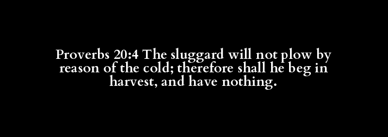 Proverbs 20:4 The sluggard will not plow by reason of the cold; therefore shall he beg in harvest, and have nothing.