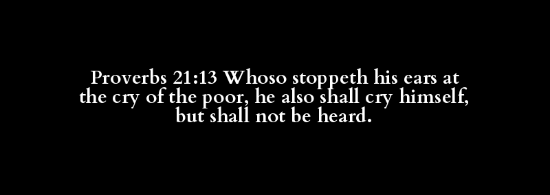 Proverbs 21:13 Whoso stoppeth his ears at the cry of the poor, he also shall cry himself, but shall not be heard.