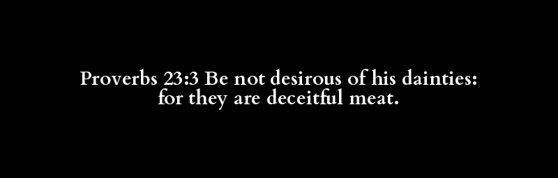 Proverbs 23:3 Be not desirous of his dainties: for they are deceitful meat.