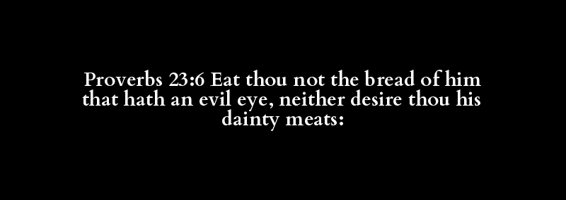 Proverbs 23:6 Eat thou not the bread of him that hath an evil eye, neither desire thou his dainty meats: