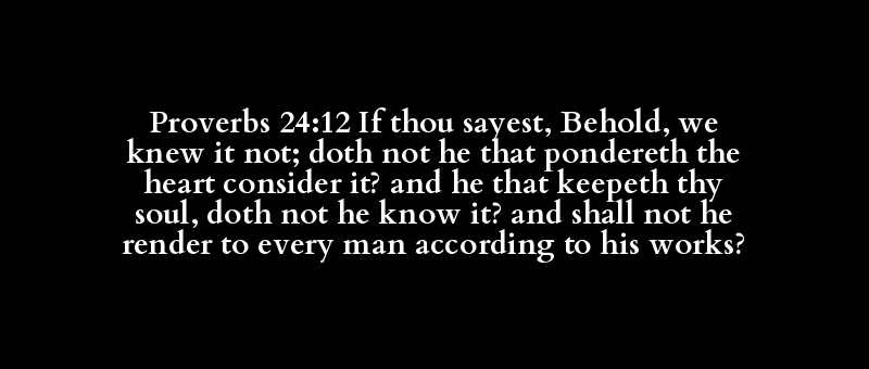 Proverbs 24:12 If thou sayest, Behold, we knew it not; doth not he that pondereth the heart consider it? and he that keepeth thy soul, doth not he know it? and shall not he render to every man according to his works?